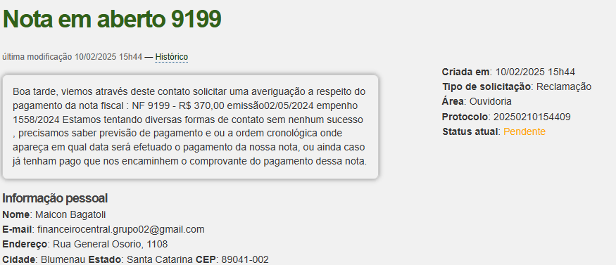 Entretanto, com o objetivo de assegurar o conhecimento dos fatos pelo órgão responsável, esta Ouvidoria procedeu ao encaminhamento da demanda à instância competente.